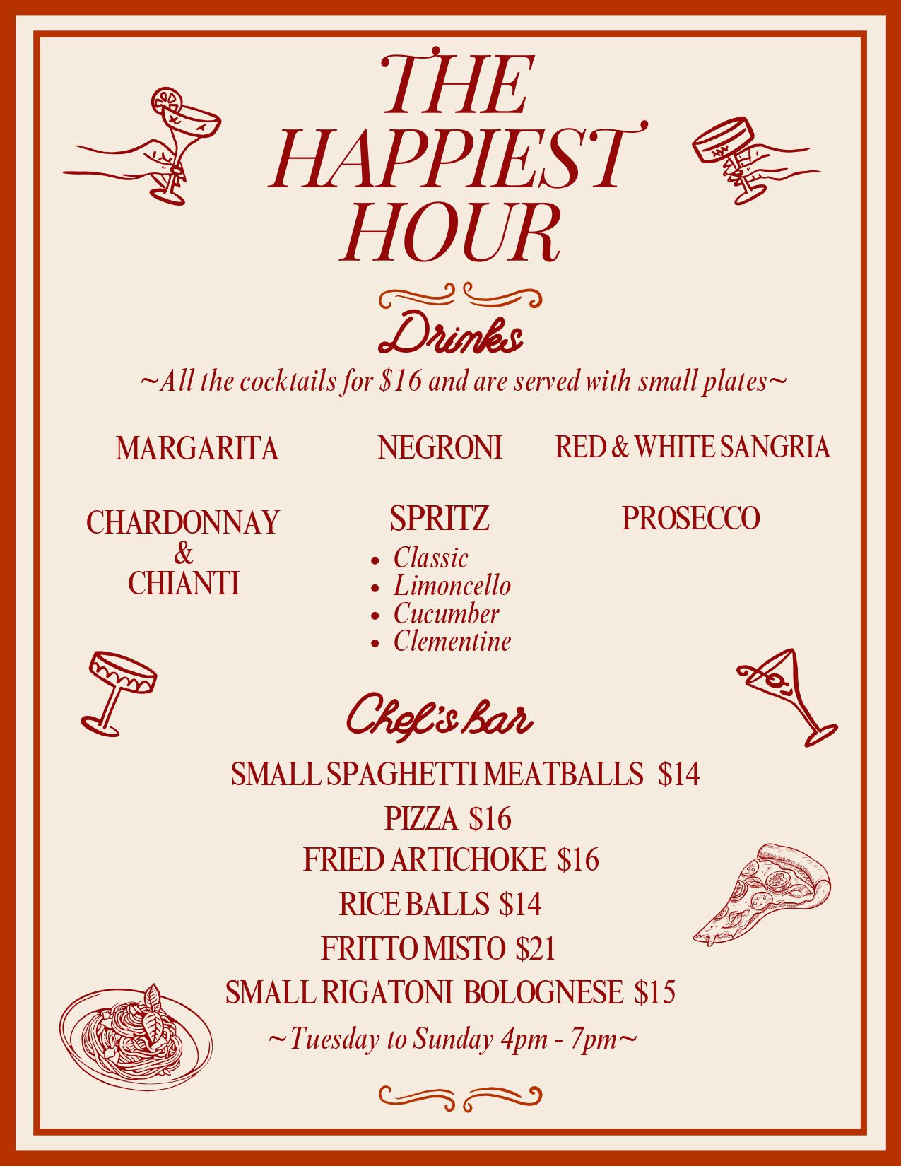 $10 Happy Hour 4 P.M.- 7 P.M. Tuesday- Sunday.